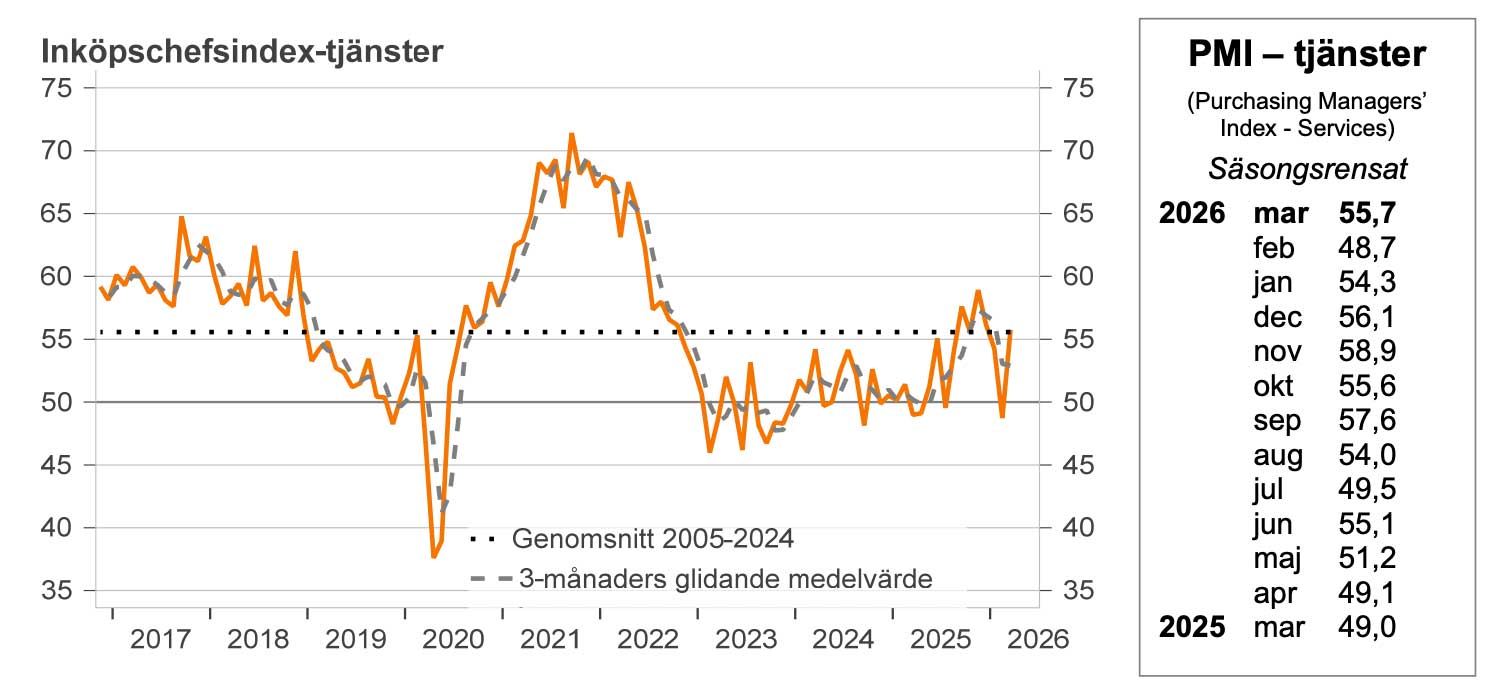 • Inköpschefsindex (PMI) för svensk industri steg till 56,3 i mars från 56,0 i februari ochfortsätter att vara över sitt historiska genomsnitt för nionde månaden i rad. Det innebär att PMI hamnade på en högre nivå under första kvartalet jämfört med fjärde kvartalet 2025.